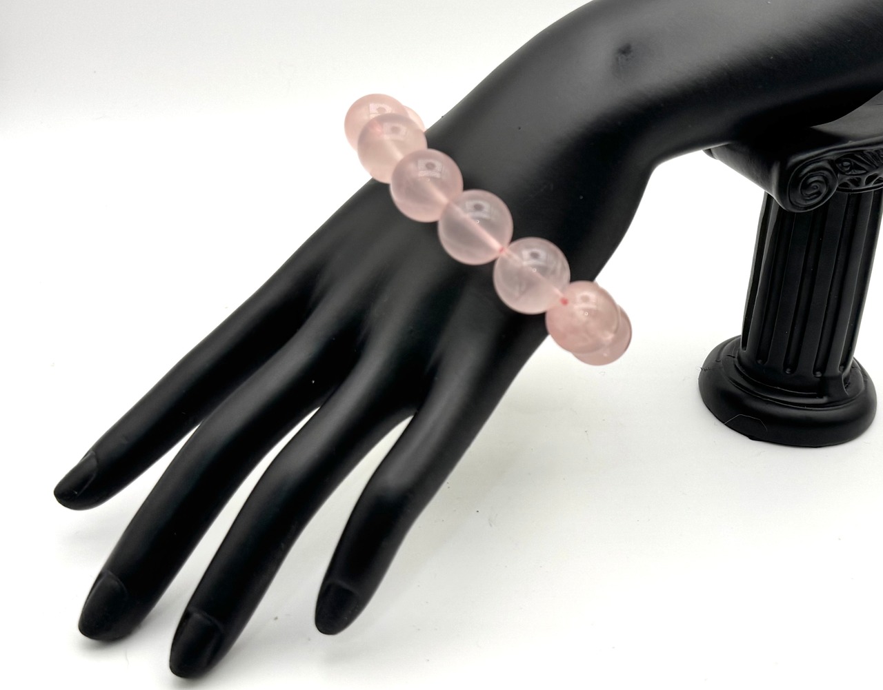 淡いピンクが優しく輝くローズクォーツの16mm大粒ブレスレット。通常流通するローズクォーツは小粒が多い中、ここまでの大粒で透明感を持ち、さらに美しい発色を保ったものは希少です。その存在感は手首に纏うだけで圧倒的で、より強いパワーを放つといわれています。