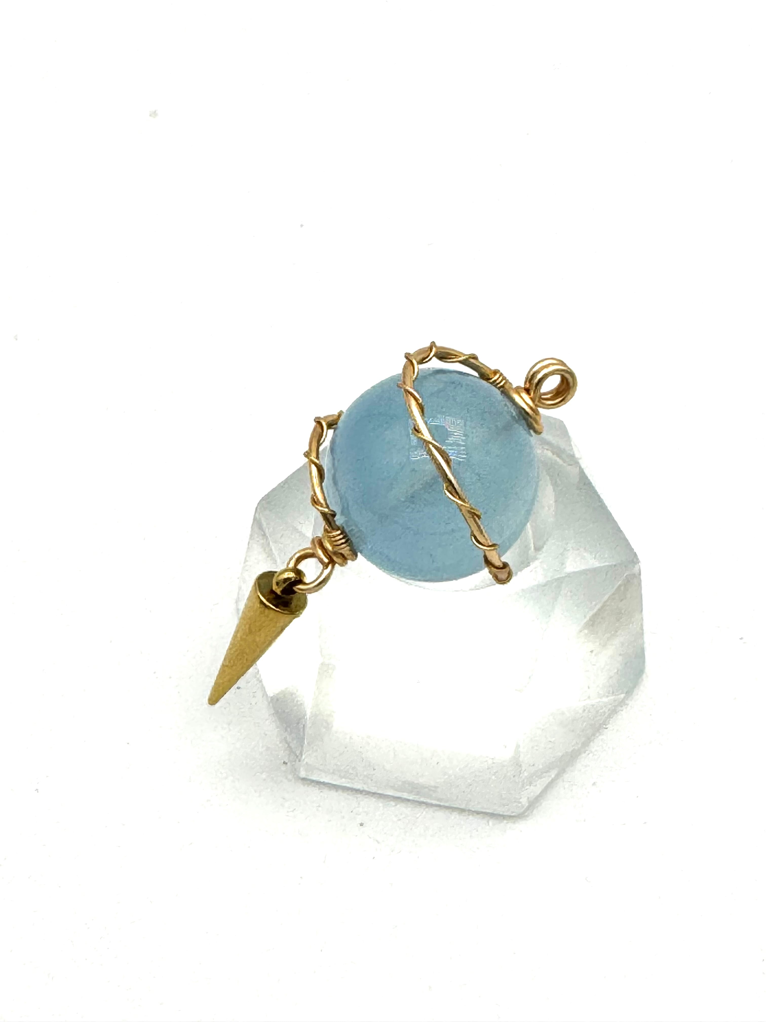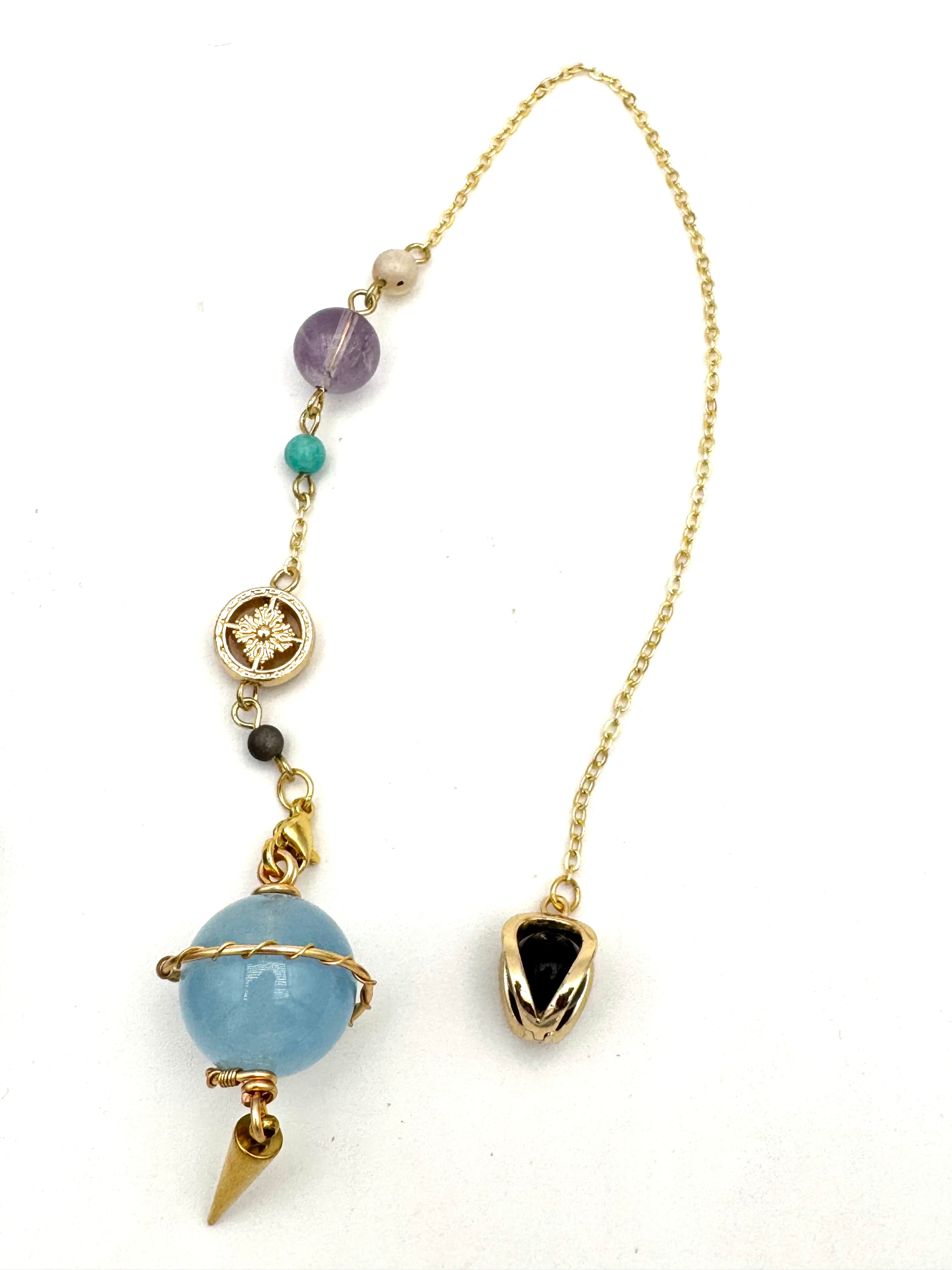 穏やかな海を思わせる水色が印象的なアクアマリンをトップに据えたペンデュラムです。やさしく透明感のあるブルーは、心の緊張をほどき、感情の揺れを鎮めながら、大切な人との関係に必要な本当の答えへと導いてくれるといわれています。